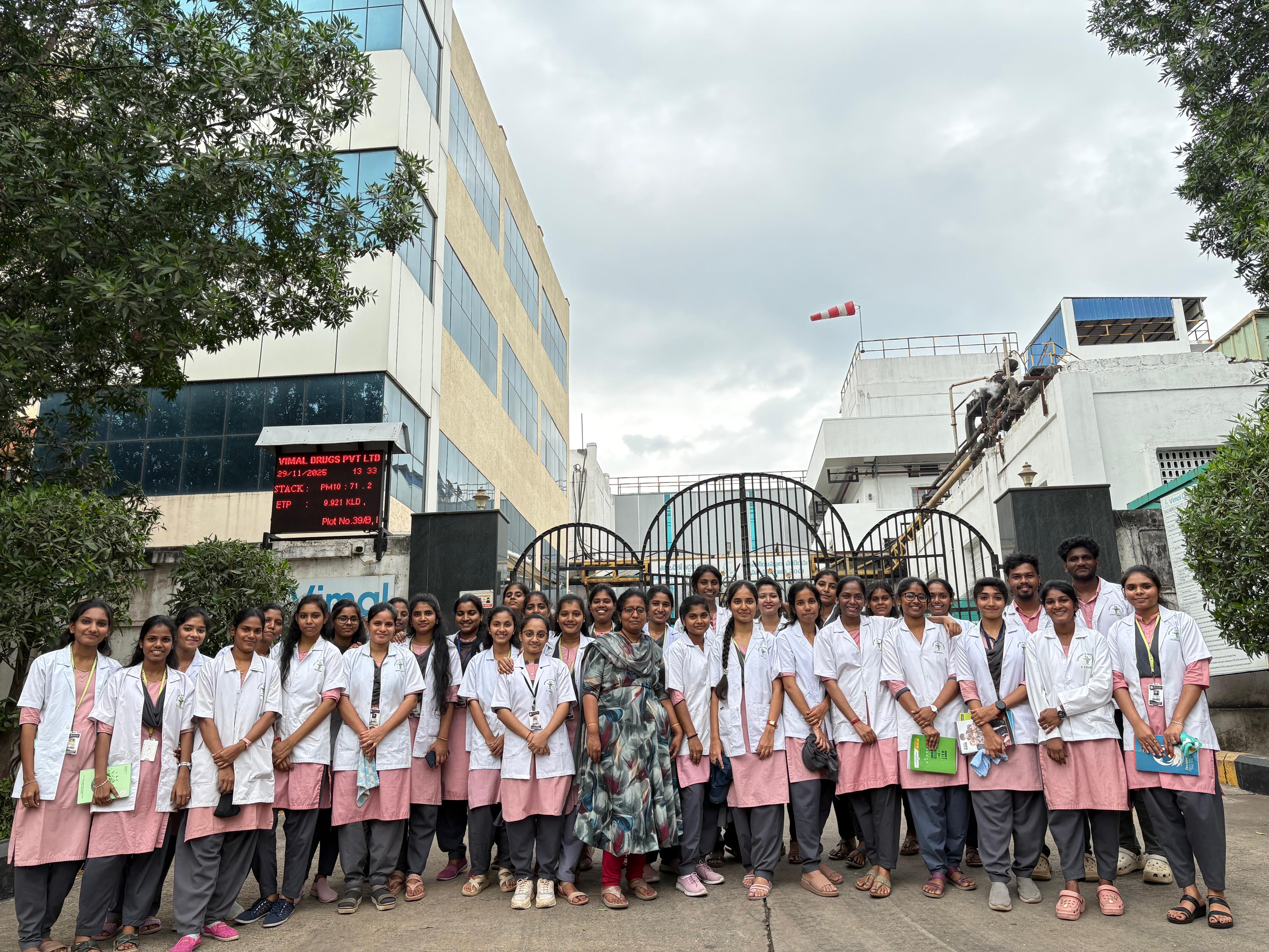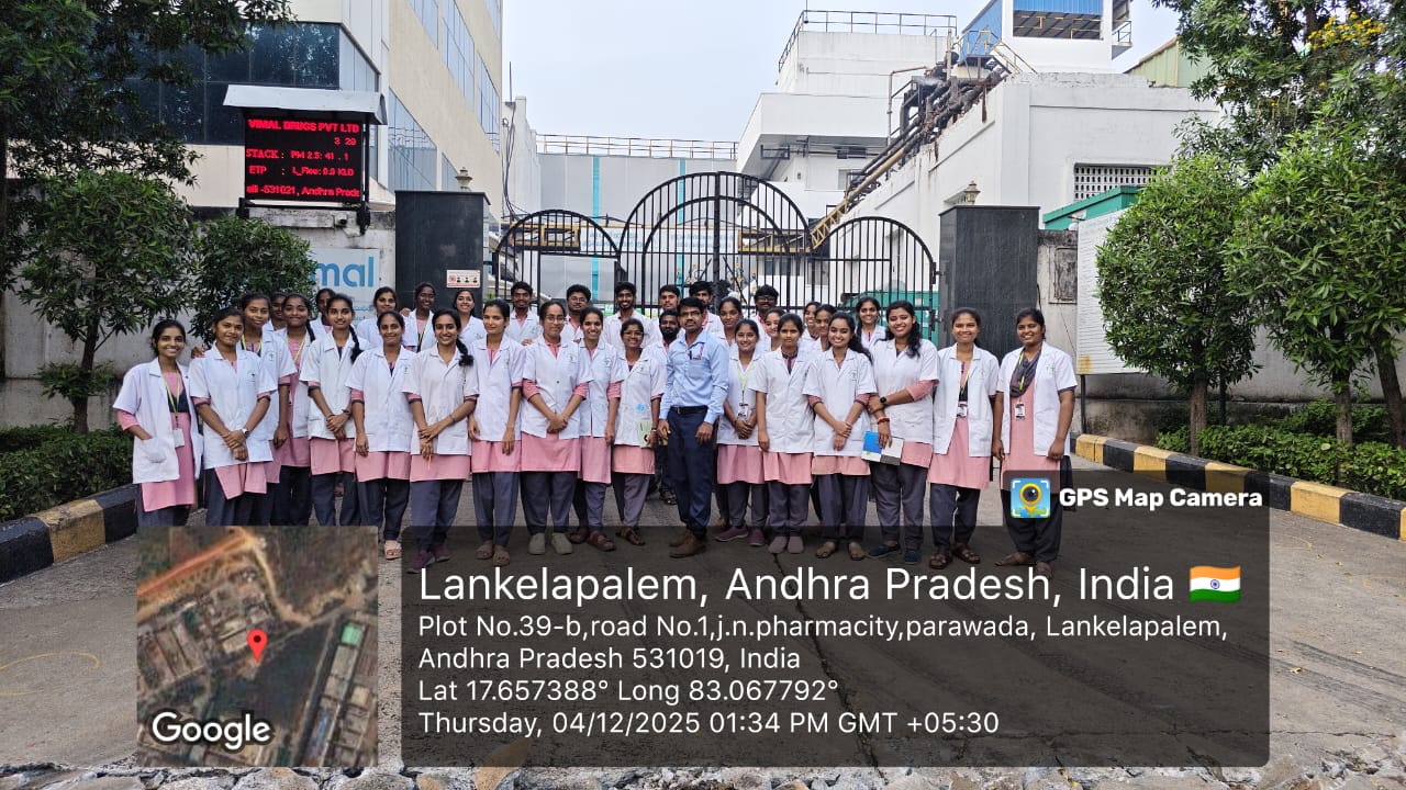 A three-day industrial visit to Vimal Drugs Pvt. Ltd., Visakhapatnam ,was organized for 4th-year B.Pharmacy students from 01-12-2024 to 03-12-2025 where they received an excellent demonstration and hands-on explanation of various analytical instruments.