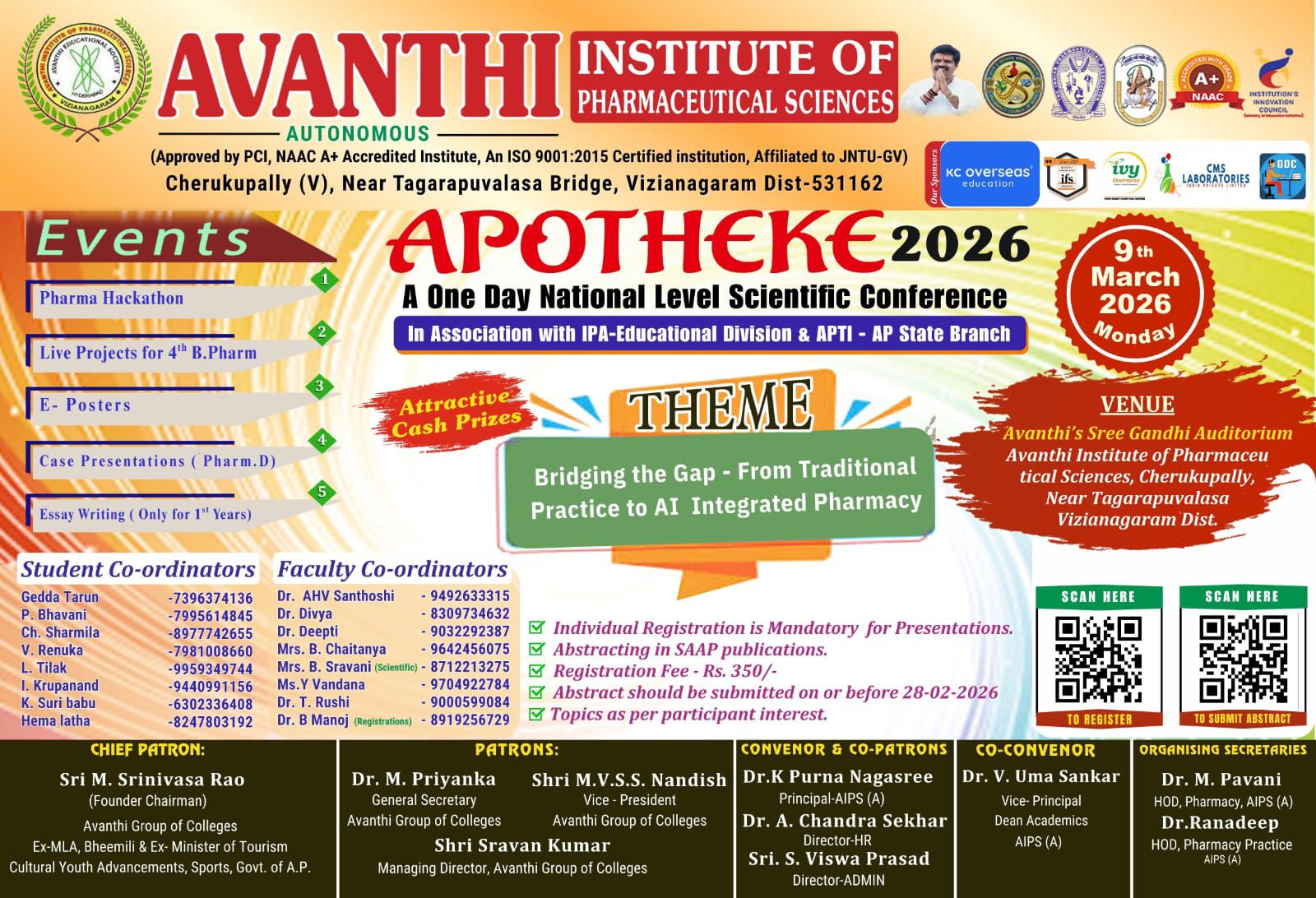 The brochure for the one day national-level scientific conference APOTHEKE 2k26 were released at Avanthi Institute of Pharmaceutical Sciences. The brochure was officially launched by Shri Muthamsetti Srinivasa Rao garu along with Director A.Chandra shekar and Principal, Dr. K. Purna Nagasree.