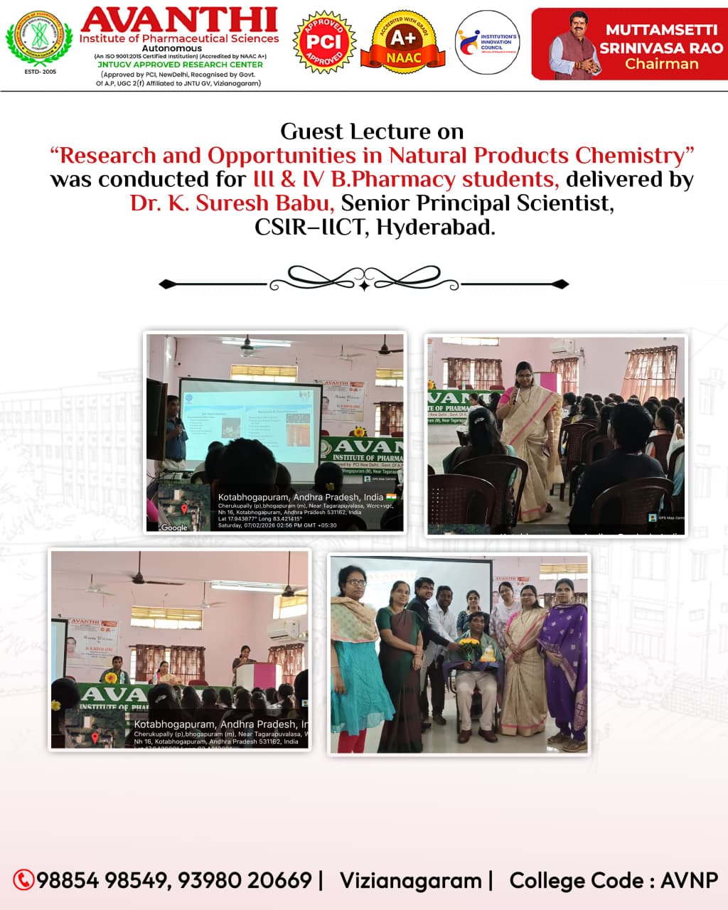 AIPS organised a guest lecture on “Research and Opportunities in Natural Products Chemistry” was conducted for III and IV B.Pharmacy students by Dr. K. Suresh Babu, Senior Principal Scientist, CSIR–IICT, Hyderabad, 07-02-2026. He highlighted current research trends and career prospects in natural products chemistry. The session was informative, interactive, and highly beneficial to the students.