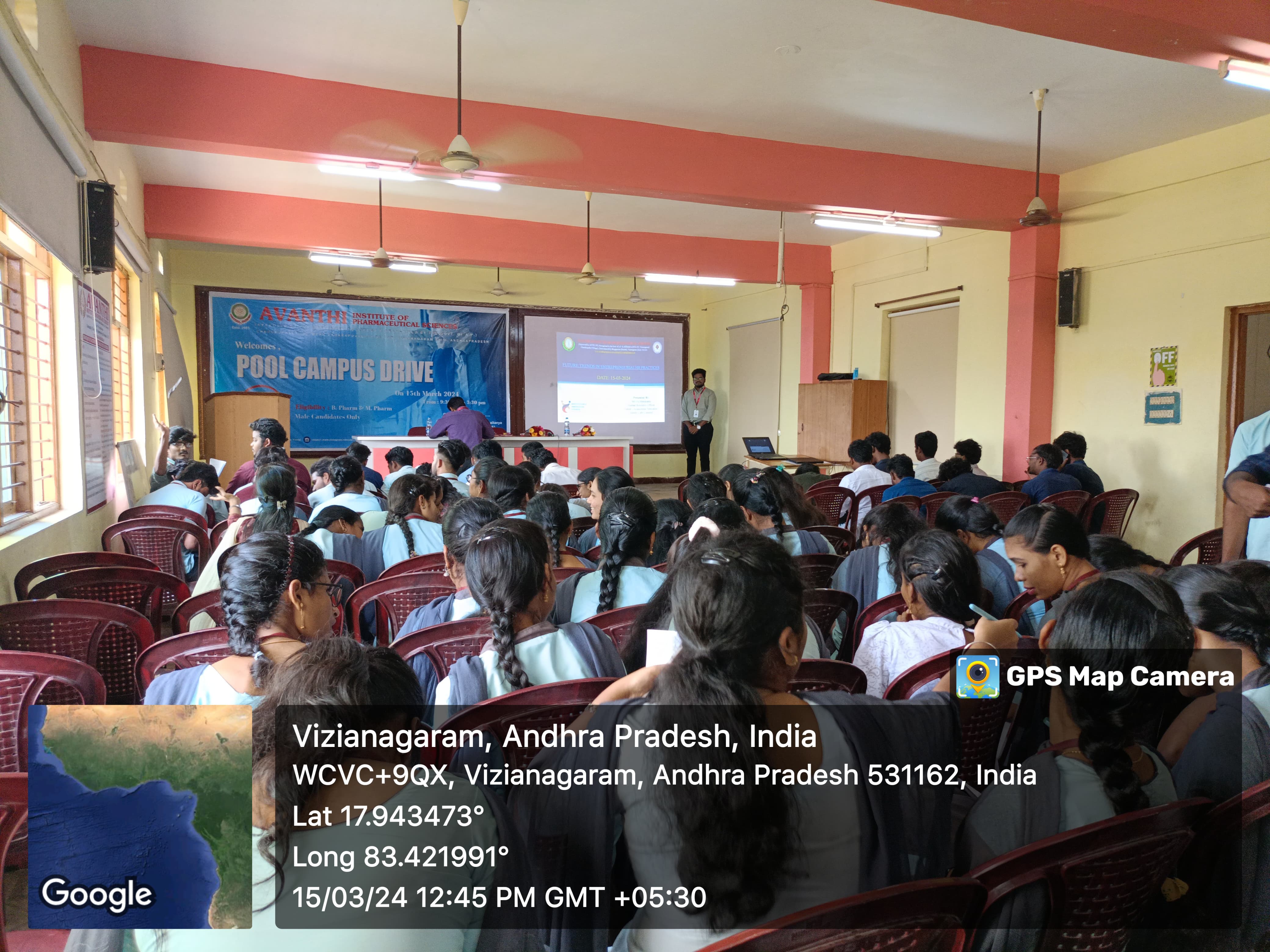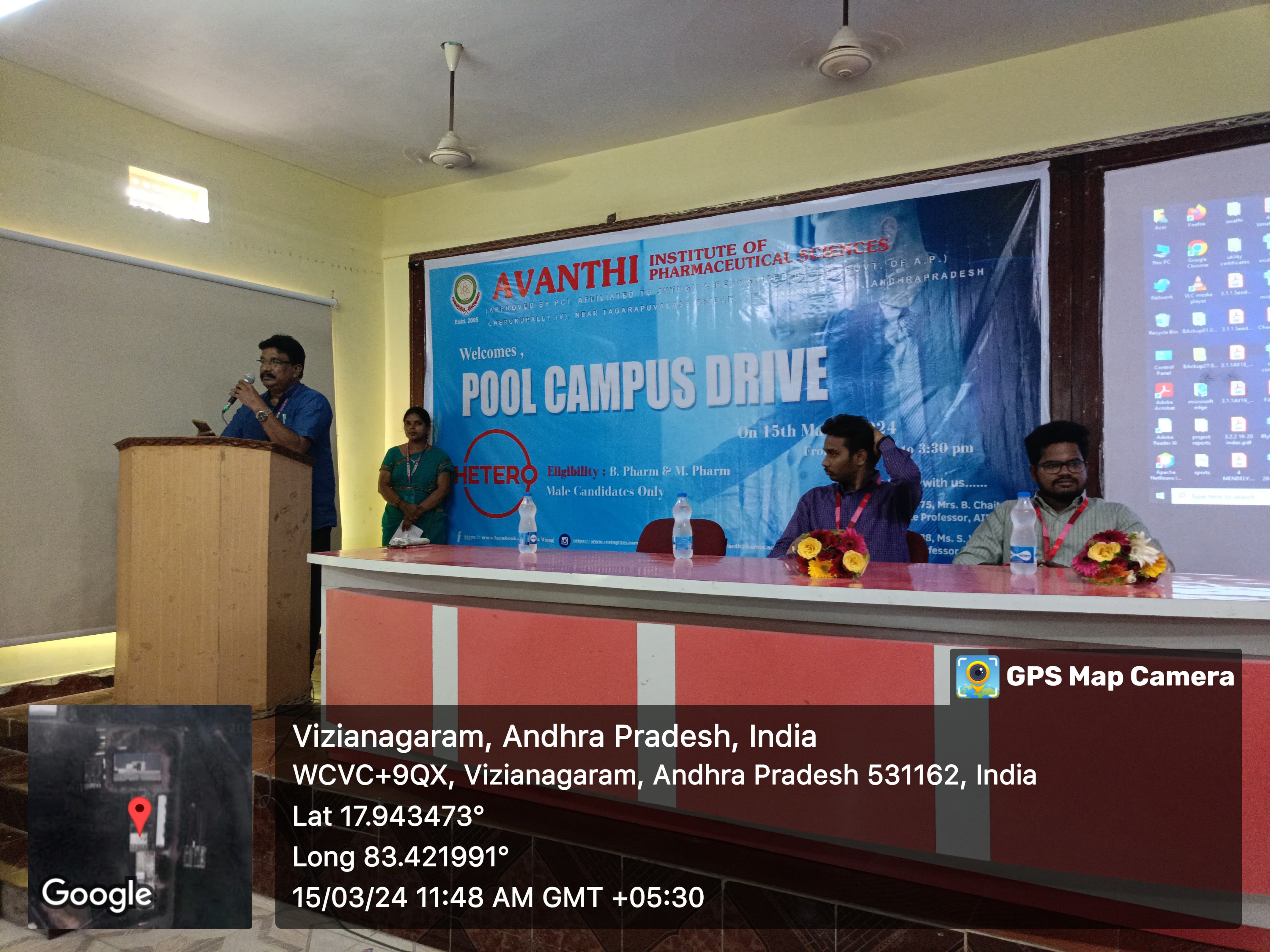 Avanthi Institute of Pharmaceutical Sciences organized Hetero Pool Campus Recruitment drive on 15th March 2024. Final year B.Pharm and M.Pharm students from Avanthi and other College students were actively participated in the drive and got selected for Hetero Drugs Pharmaceutical Company.