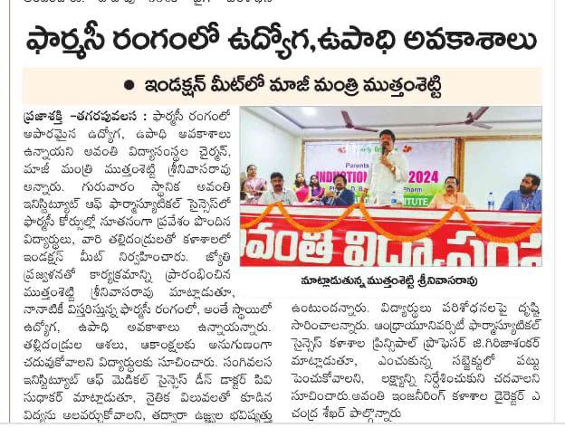Avanthi Institute of Pharmaceutical Sciences Organized an Induction Meet to B.Pharm and Pharm.D Freshers on 19th December 2024. Dr.M.B.V Raju, Principal, AIPS addressed the fresher students and ther Parents gathering and welcomed them. Prof.G.Girija Shankar, Principal, A.U.College of Pharmaceutical Sciences, Andhra University was invited as Guest of Honor and Dr. P.V.Sudhakar, Dean, NRI Institute of Medical Sciences was invited as Chief Guest to the Induction Meet. Sri M.Srinivasa Rao garu, Founder Chairman, Avanthi Group of Institutions graced the occasion and all the dignitaries have given Valuable Insights on Pharmacy Profession and career pathways to all the Budding Pharmcists and congratulated them for Choosing the Pharmacy Programs in this Institution.