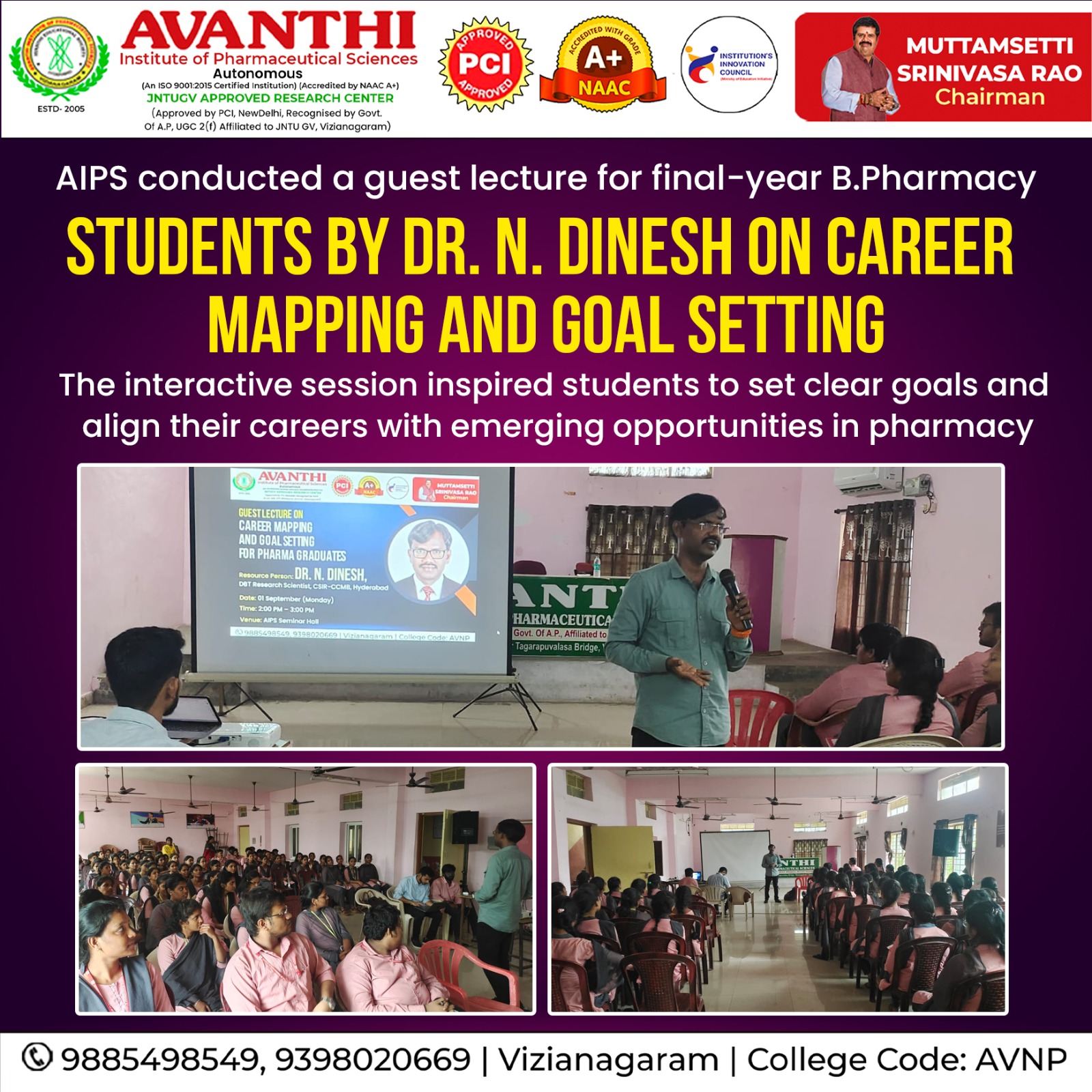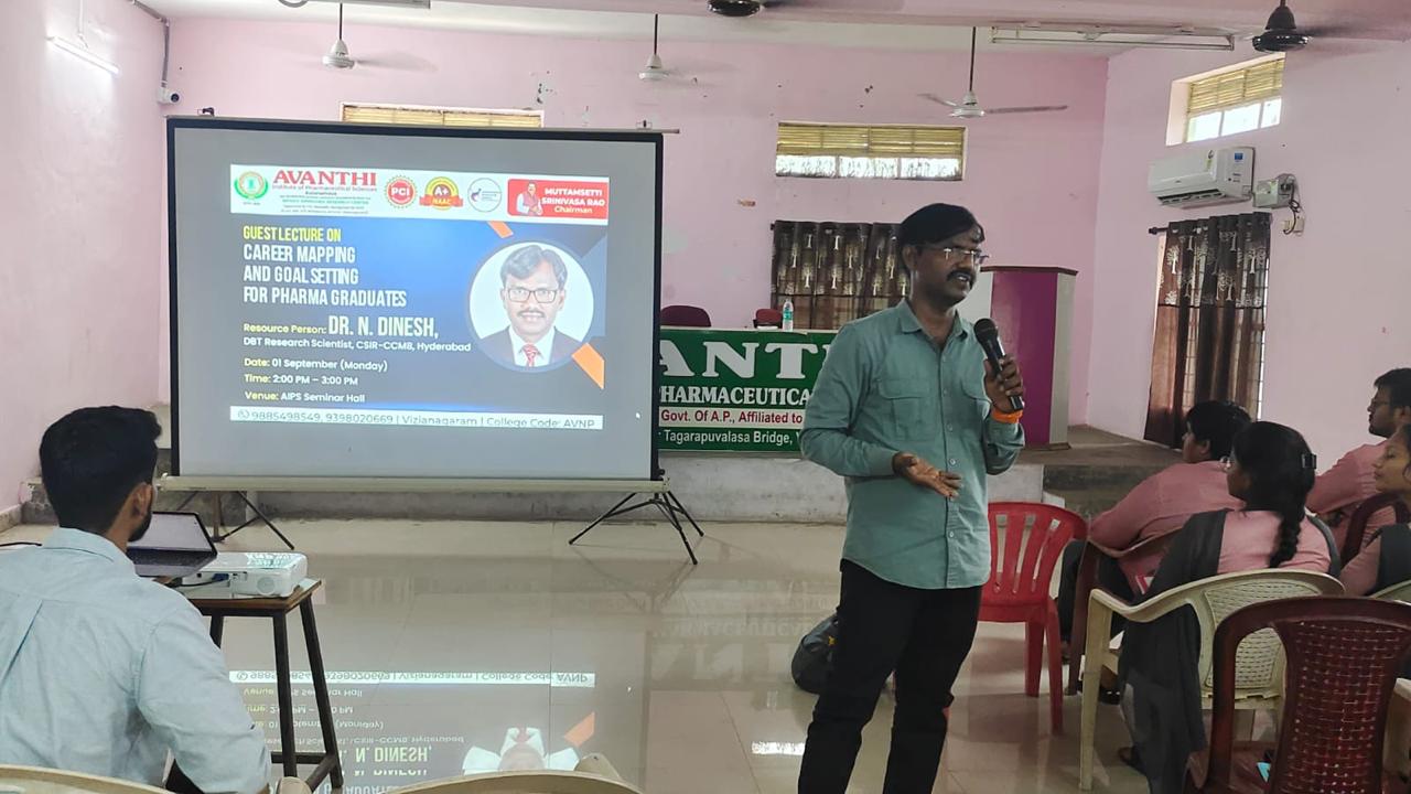 AIPS organized a guest lecture on 01-09-2025 for final-year B. Pharmacy students, delivered by Dr. N. Dinesh, on the topic Career Mapping and Goal Setting for Pharma Graduates.The lecture was highly interactive and insightful, motivating students to set clear goals and align their career paths with emerging opportunities in the pharmacy profession.